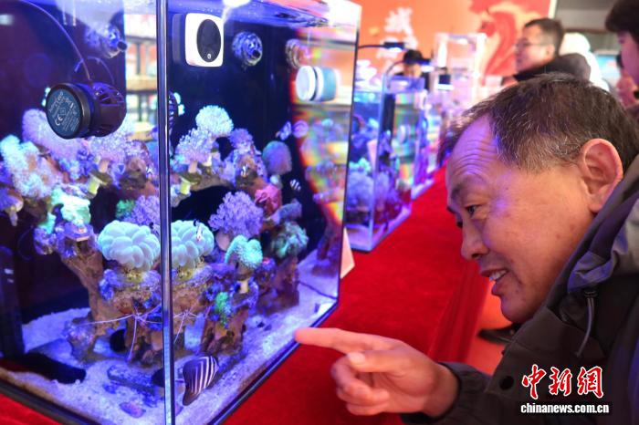 2月18日,游人正在庙会鱼市赏鱼。当日是华夏阴历一月始两,山东东营举行“乡北庙会”,吸收游人观光。庙会会聚浙江婺剧、祸州游神、潮汕英歌舞等特性习惯演出,为新秋添加了文明年味。 孙琳茹 摄
