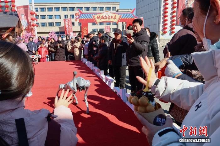 2月18日,游人取呆板狗互动。当日是华夏阴历一月始两,山东东营举行“乡北庙会”,吸收游人观光。庙会会聚浙江婺剧、祸州游神、潮汕英歌舞等特质风俗上演,为新秋添加了文明年味。 孙琳茹 摄