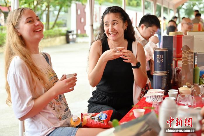 届英德白茶头采季举动正在位于广东省英德市的白旗茶厂推启帐蓬。图为中邦同伴品味英德白茶。中新社记者 旧楚白 摄