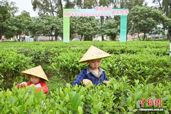 3月28日,以“英德秋开 头采飘喷鼻”为大旨的2026年第8届英德白茶头采季举动正在位于广东省英德市的白旗茶厂推启帐篷。图为小同伙正在茶园阅历采茶。中新社记者 旧楚白 摄
